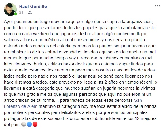 Tras el inconveniente de la ambulancia del día sábado, el manager del equipo, Raúl Gordillo, hizo un descargo en su cuenta de Facebook manifestando que lo sucedido «escapa a la organización» a cargo de San Lorenzo. Este es el descargo: