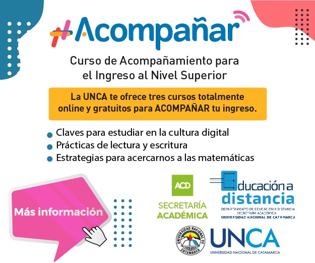 El Departamento de Educación a Distancia de la Secretaría Académica de la UNCA, informa que están abiertas las inscripciones para la edición agosto del curso de acompañamiento para el ingreso al nivel superior “ACOMPAÑAR”.