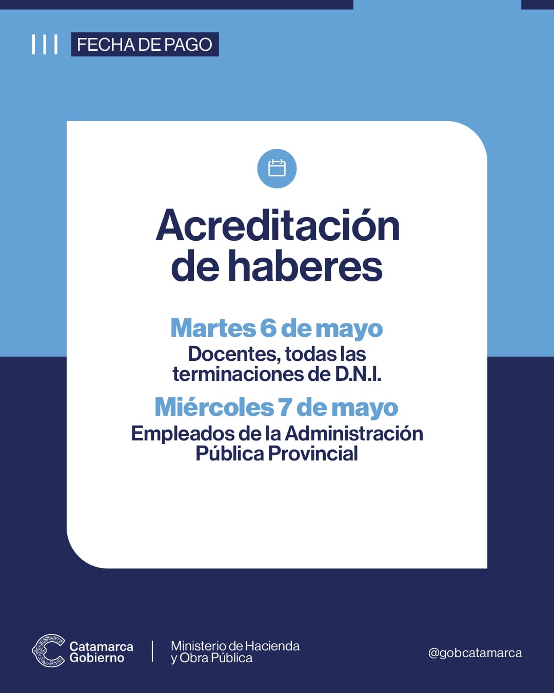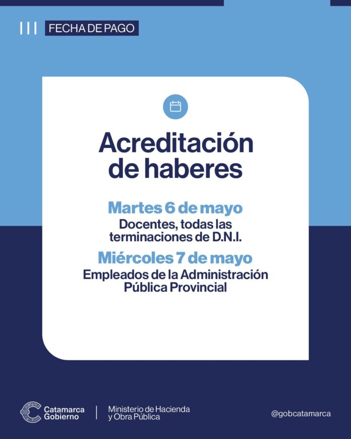 El Ministerio de Hacienda y Obra Pública informa que ya se definió el cronograma de acreditación de haberes correspondientes al mes de abril de 2025, que se cumplirá de la siguiente manera: