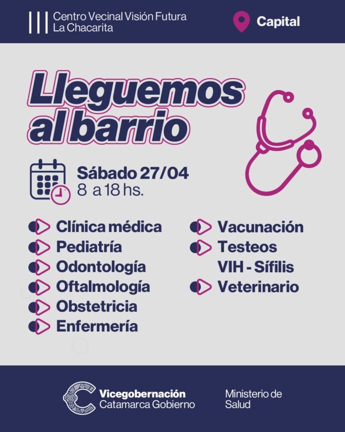 El Ministerio de Salud de la Provincia, a través del Programa Lleguemos al Barrio, brindará asistencia mañana, sábado 27 de abril, en el Centro Vecinal “Visión Futura”, ubicado en La Chacarita, de 8 a 18 horas.