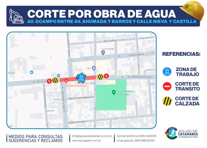 Aguas de Catamarca informa que trabaja en el mantenimiento del sistema de agua potable en calle Av. Ocampo entre Av. Ahumada y Barros y calle Nieva y Castilla.