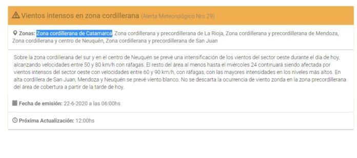En la página oficial del SMN se advierte que sobre la zona cordillerana del sur y en el centro de Neuquén se prevé una intensificación de los vientos del sector oeste durante el día de hoy, alcanzando velocidades entre 50 y 80 km/h con ráfagas. El resto del área al menos hasta el miércoles 24 continuará siendo afectada por vientos intensos del sector oeste con velocidades entre 60 y 90 km/h, con ráfagas, con las mayores intensidades en los niveles más altos. En alta cordillera de San Juan, Mendoza y Neuquén se prevé viento blanco. No se descarta la ocurrencia de viento zonda en la zona precordillerana del área de cobertura a partir de la tarde del lunes. Afectando esto a zona cordillerana de Catamarca, zona cordillerana y precordillerana de La Rioja, zona cordillerana y precordillerana de Mendoza, zona cordillerana y centro de Neuquén, zona cordillerana y precordillerana de San Juan.