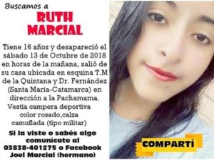 Ruth Marcial, de 16 años, había salido desde su vivienda en Tomás María de la Quintana esquina Dr. Fernández el sábado por la mañana. Salió a caminar, rumbo a la Pachamama, en el ingreso de Santa María, como solía hacerlo. Al momento de la desaparición vestía una campera deportiva color rosa y calza camuflada tipo militar.