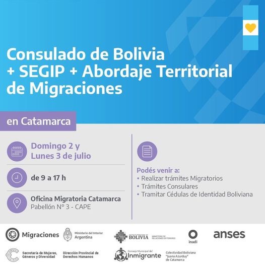 Durante los días 2 y 3 de julio, el INADI estará acompañando la Atención Consular de Bolivia en la Oficina Migratoria Catamarca ubicada en el Pabellón 3 del CAPE de 9 a 17 horas