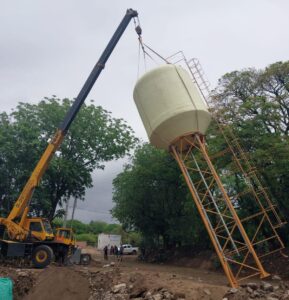 Este tanque tiene una capacidad total de 50,000 litros y es parte de un proyecto que incluye la reestructuración del azud nivelador de toma en la vertiente y la instalación de 2,000 metros de tuberías de aducción desde allí hasta la Planta.