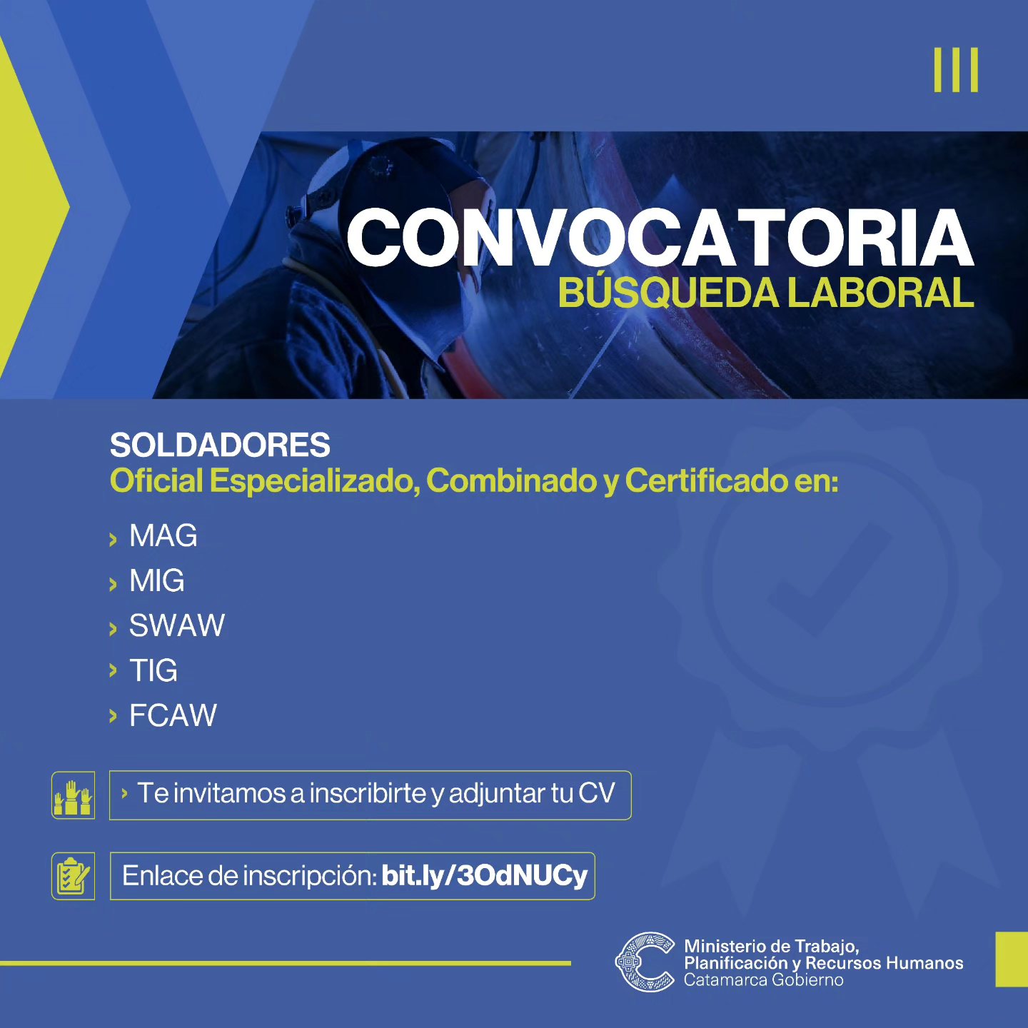 La convocatoria solicita soldadores oficial especializado, combinado y certificado en MAG, MIG, SWAW, TIG, FCAW.
