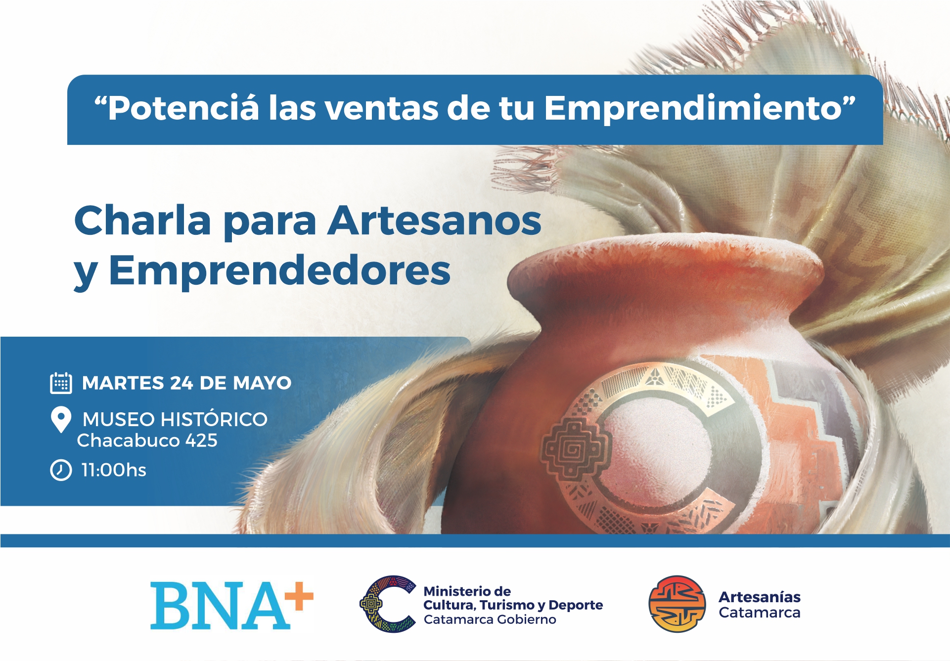Potenciá las ventas de tu emprendimiento. Charla para artesanos y emprendedores propuesta por el Banco Nación, con capacitación en la billetera BN+. Se dictará el martes 24 de mayo a las 11 hs en el Museo Histórico, Chacabuco 425.