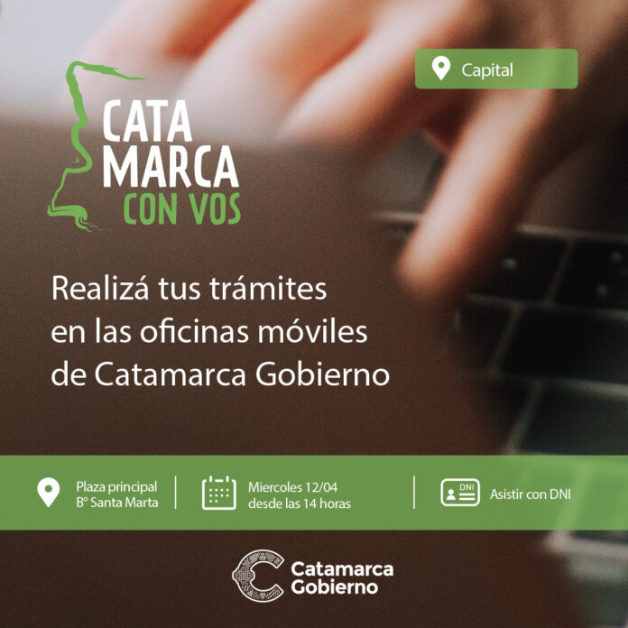 El programa provincial que acerca los trámites y servicios a todos los catamarqueños llega al Barrio Santa Marta. A través de móviles ubicados en puntos estratégicos, “Catamarca con Vos” en conjunto con “Municipio en tu Barrio”, estará presente este miércoles 12 de abril, de 14:00 a 18:00 horas en la plaza principal del barrio, ubicado al sur de la ciudad Capital.