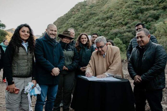 El gobernador Raúl Jalil junto al Ministro de Agua, Energía y Medio Ambiente Lucas Zampieri y María Elena Sánchez, Directora del NOA de la Administración de Parques Nacionales, firmaron la elevación a las Cámaras del Proyecto de Ley para la declaración de la creación del «Parque y Reserva Nacional Sierras de Ambato»