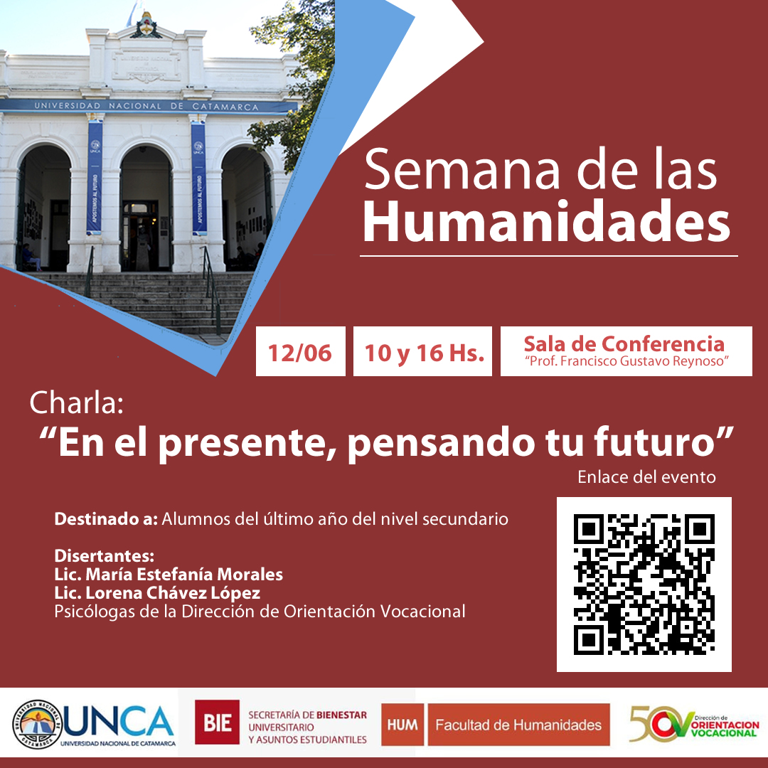 En el marco de los 50 años de la Dirección de Orientación Vocacional y de la Semana de Humanidades, se realizará la Charla “En el presente, pensando tu futuro”, destinada a los alumnos del último año del secundario, el miércoles 12 de junio.