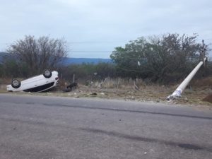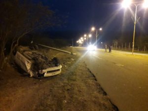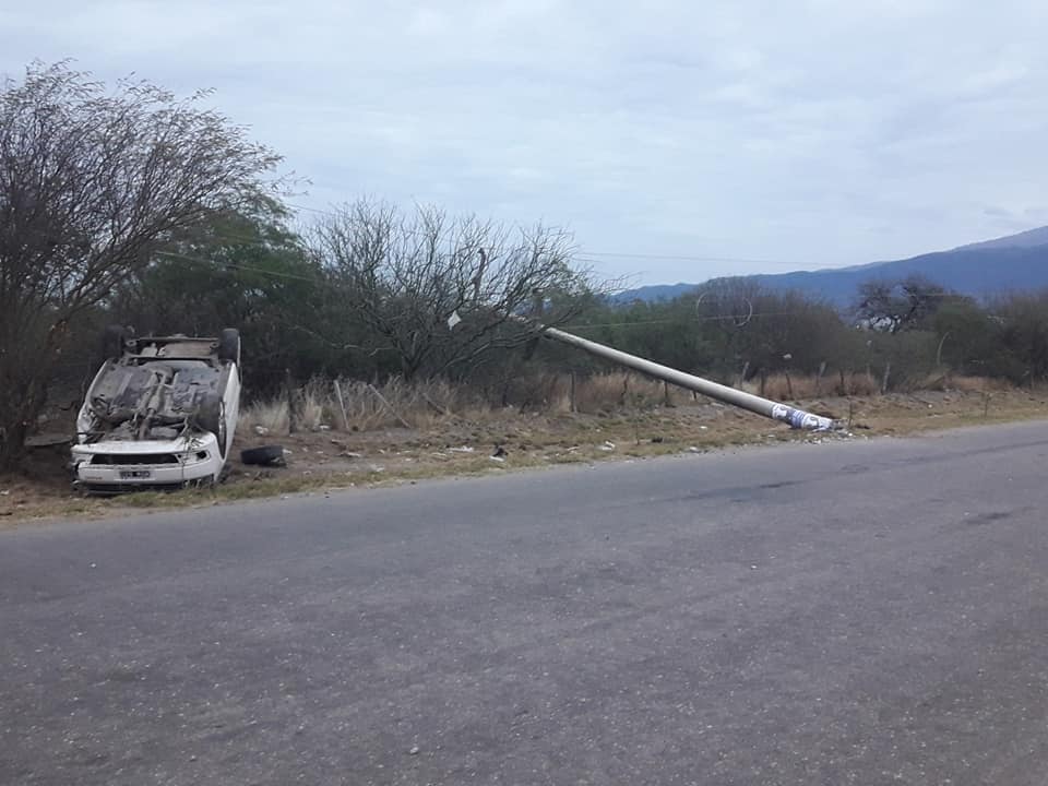 En las primeras horas de esta mañana, un Volkswagen Suran blanco se estrelló contra un poste de tendido eléctrico de cemento y terminó volcando de manera violenta.