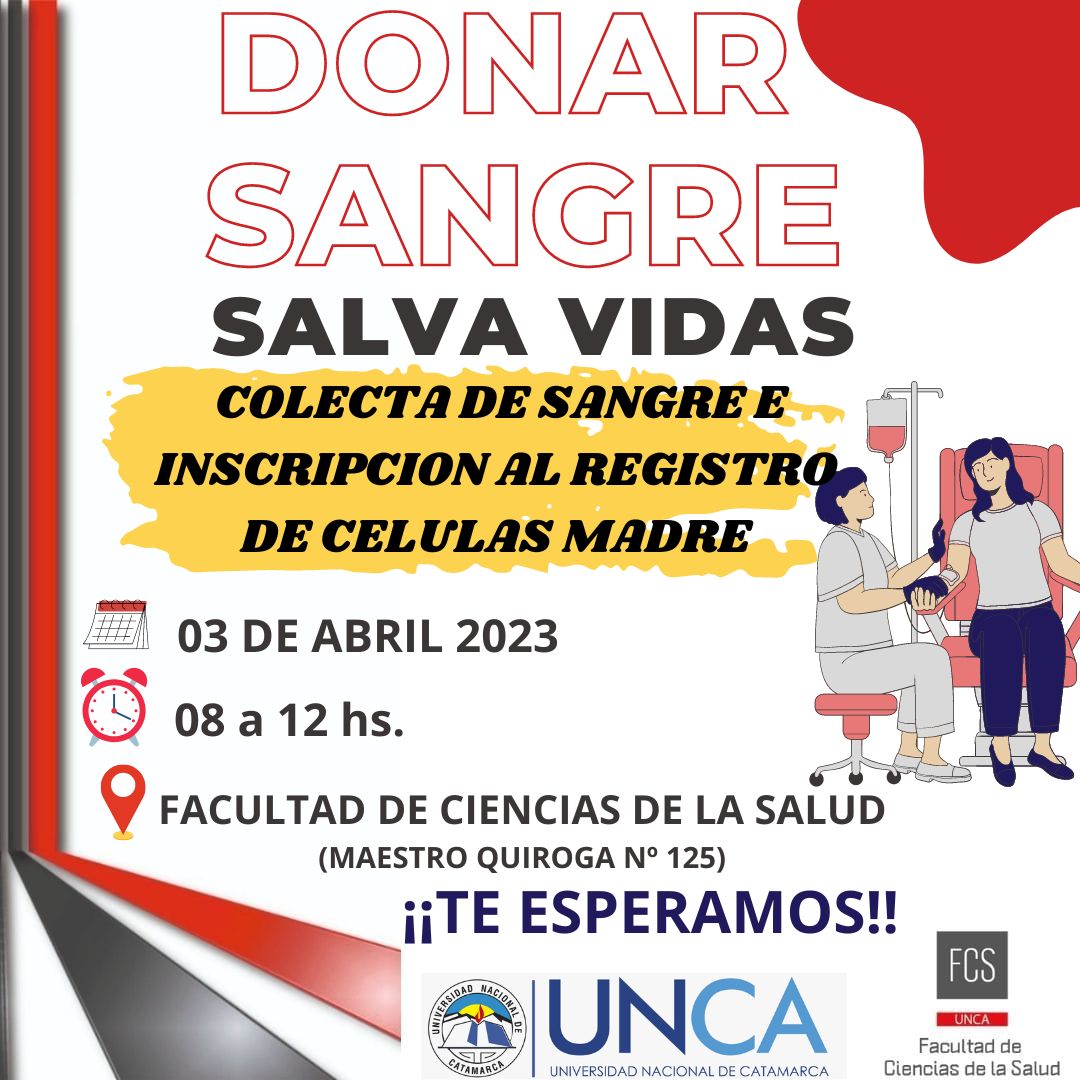 La Facultad de Ciencias de la Salud de la Universidad Nacional de Catamarca conjuntamente con el Banco Central de Sangre de la Provincia y el CAICA en representación del INCUCAI, llevará a cabo una Colecta de sangre e inscripción al registro de células madre, en conmemoración del “Día Nacional del Donante de Médula Ósea”. El evento se desarrollará el día lunes 3 de abril del corriente, de 8:00 a 12:00 Hs. en la Facultad de Ciencias de la Salud (Av. Maestro Quiroga 125).
