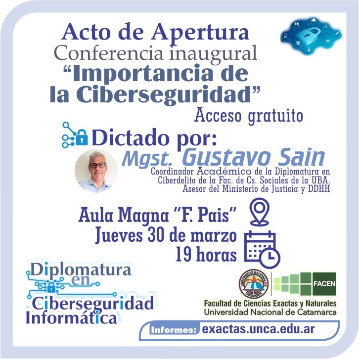 Con un acto que se realizará el jueves 30 de marzo a las 19:00 horas en el Aula Magna de la UNCA, la Facultad de Ciencias Exactas y Naturales (FACEN), dará inicio oficialmente al dictado de la Diplomatura en Ciberseguridad Informática.
