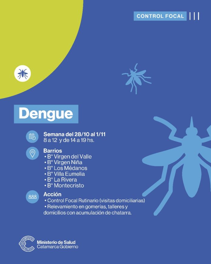 El Ministerio de Salud informa que, en el marco de las acciones de prevención y control del dengue, se llevará a cabo un operativo de Control Focal intensivo del 28 de octubre al 1 de noviembre en las zonas prioritarias de los barrios Virgen del Valle, Virgen Niña, Los Médanos, Villa Eumelia, La Rivera y Montecristo. El objetivo de esta intervención es reducir la presencia del mosquito Aedes aegypti mediante visitas domiciliarias y relevamientos en espacios de riesgo, tales como gomerías, talleres y domicilios con acumulación de chatarra, donde suelen encontrarse posibles criaderos.