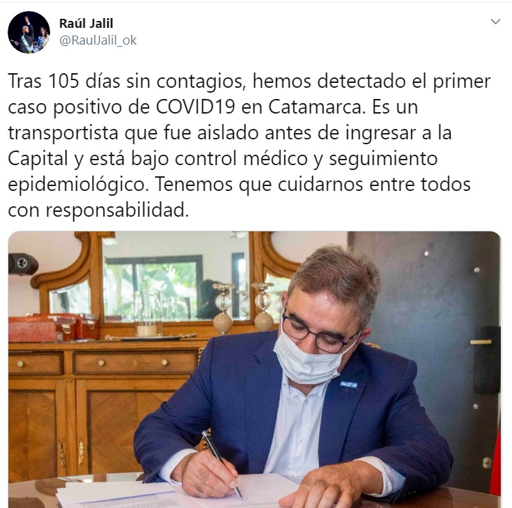 «Tras 105 días sin contagios, hemos detectado el primer caso positivo de COVID19 en Catamarca. Es un transportista que fue aislado antes de ingresar a la Capital y está bajo control médico y seguimiento epidemiológico. Tenemos que cuidarnos entre todos con responsabilidad», publicó el gobernador Jalil en su cuenta de Instagram .