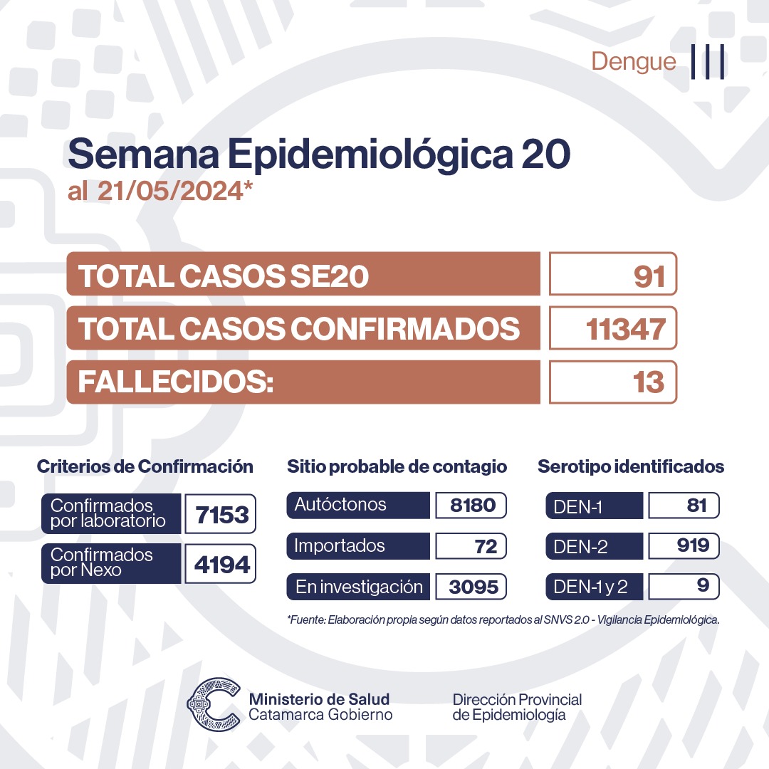 El Ministerio de Salud informa que durante la Semana Epidemiológica 20, del 13 al 19 de mayo de 2024, se registraron 91 nuevos casos de Dengue.