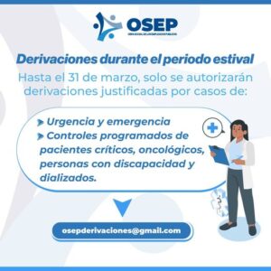 La Obra Social de los Empleados Públicos (OSEP Catamarca) informó en redes sociales que «las derivaciones sólo se autorizarán de manera justificada por casos de urgencia, emergencia y controles programados para pacientes críticos, oncológicos, personas con discapacidad y dializadas hasta el 31 de marzo».