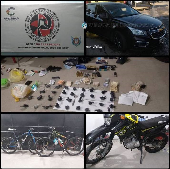 En el lugar, los Policías secuestraron la suma de ciento setenta y cuatro mil setecientos cuarenta pesos ($174.740) en efectivo, seis (06) teléfonos celulares, un (01) automóvil Chevrolet Cruze negro, treinta y cinco (35) envoltorios de nylon conteniendo en su interior una sustancia tipo polvo, los cuales fueron sometido a la prueba de campo correspondiente, determinando que se tratarían de 845 Grs. de Clorhidrato de Cocaína, dos (02) bolsas conteniendo la misma sustancia, una (01) cuchara, una (01) balanza digital tipo gramera, una (01) motocicleta Yamaha XTZ 250 cc., dos (02) bicicletas GIANT y SLP, un (01) revólver calibre 44 Magnum, una (01) pistola Vereta calibre 9 mm., bolsas y recortes de nylon de diferentes tamaños, tres (03) chip de telefonía celular de diferentes empresas, varios cartuchos calibres 22, 38 y 44 Magnum, un (01) reproductor de DVD con su cable de alimentación, y una (01) gorra de color negro, de interés para la causa.