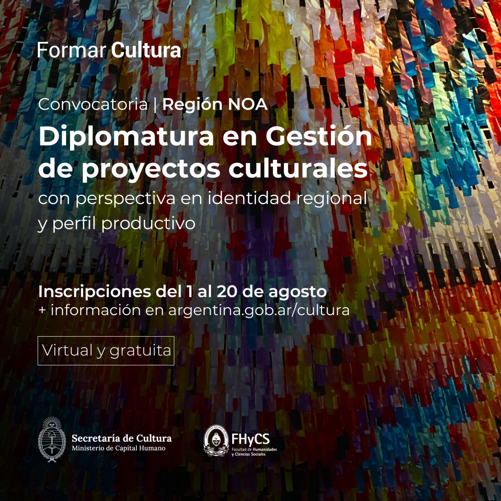 La diplomatura, que se llevará a cabo en modalidad virtual, tiene una duración de tres meses y la inscripción para los interesados está abierta hasta el 20 de agosto. La convocatoria está destinada a gestores, hacedores y agentes de la cultura u otras carreras, que estén interesados en el campo de la cultura y el desarrollo de proyectos de base cultural con identidad regional y perfil productivo, que residan en las provincias de Catamarca, La Rioja, Jujuy, Salta, Santiago del Estero y Tucumán, sin requerir título universitario previo.