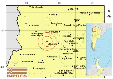 Epicentro: 154 km al O de San Miguel De Tucumán; 227 km al NO de San F. Del Valle De Catamarca; 69 km al O de Sta.María -26.599 (lat) -66.728 (long)