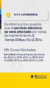 Desde la empresa de energía de Catamarca se informa a los usuarios que el día viernes 10 de mayo de 8 a 13.30 hs se vera afectado el servicio de energía eléctrica por obras de mantenimiento.