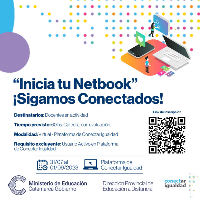 El Ministerio de Educación mediante de la dirección provincial de Educación a Distancia, informa que desde este jueves 27 de julio, se encuentra abierta la inscripción para la capacitación (réplica) denominada: “Inicia tu Netbook” ¡Sigamos Conectados!, destinada a docentes en actividad de Nivel Secundario cuyos alumnos cuenten con las Netbooks Educativas del Programa Provincial “Sigamos Conectados”, entregadas durante los ciclos lectivos 2022/2023.