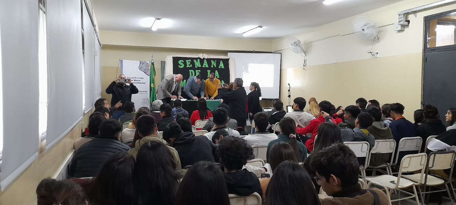 La firma tuvo lugar en la sede de la Escuela de Minería «Dr. Bernardo Houssay», donde estuvo presente también el director de la institución, Edgardo Herrera.
