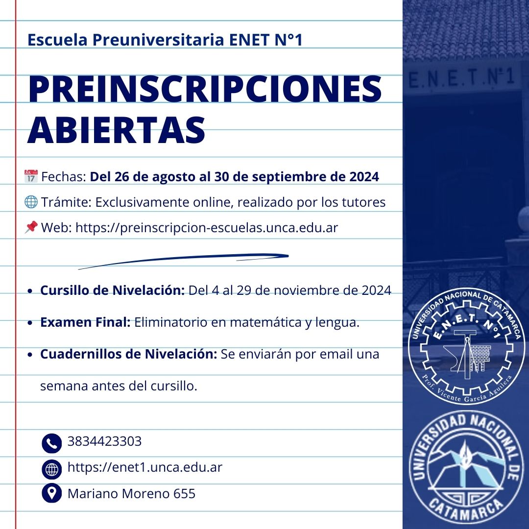 La Escuela Preuniversitaria ENET N°1 informa a todos los interesados que el período de preinscripción estará abierto desde el 26 de agosto hasta el 30 de septiembre de 2024. El trámite de preinscripción deberá ser realizado exclusivamente por los tutores de los estudiantes a través del sitio web: https://preinscripcion-escuelas.unca.edu.ar.