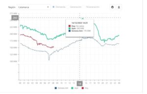 Desde la Gerencia de Distribución de EC SAPEM se difundió información del Sistema de Supervisión, Control y Adquisición Datos (SCADA), dando cuenta de que ese caluroso miércoles, el Valle Central de Catamarca registró un consumo eléctrico de 260 megavatios de potencia. Dicho registro contrasta con el promedio de consumos de la semana anterior, cuando se consumieron en promedio 176 MW de potencia. Es decir, que de una semana a otra el consumo aumentó un 45 por ciento. El registro de los 260 megavatios de potencia consumida es el máximo consumo registrado en la provincia de Catamarca, superando al anterior récord de consumo registrado en el año 2022, los 249 megavatios de potencia.