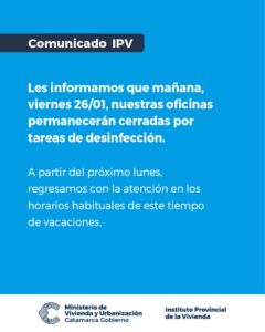 El Instituto Provincial de la Vivienda informó en un comunicado oficial que sus oficinas estarán cerradas este viernes 26 de enero por tareas de desinfección.