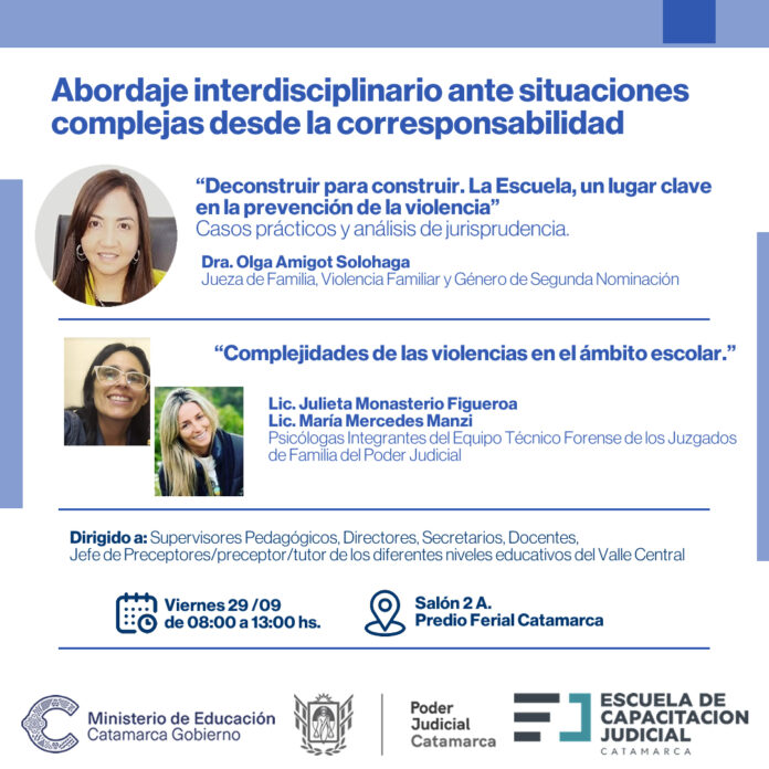 Dicho evento contará con la disertación “Deconstruir para construir»; La Escuela, un lugar clave en la prevención de la violencia”, con casos prácticos y análisis de jurisprudencia a cargo de la Dra. Olga Amigot Solohaga, Jueza de Familia, Violencia Familiar y Género de Segunda Nominación. Además, se trabajará sobre las “Complejidades de las violencias en el ámbito escolar” con la Lic. Julieta Monasterio Figueroa y la Lic. María Mercedes Manzi, Psicólogas integrantes del equipo técnico forense de los Juzgados de Familia del Poder Judicial.
