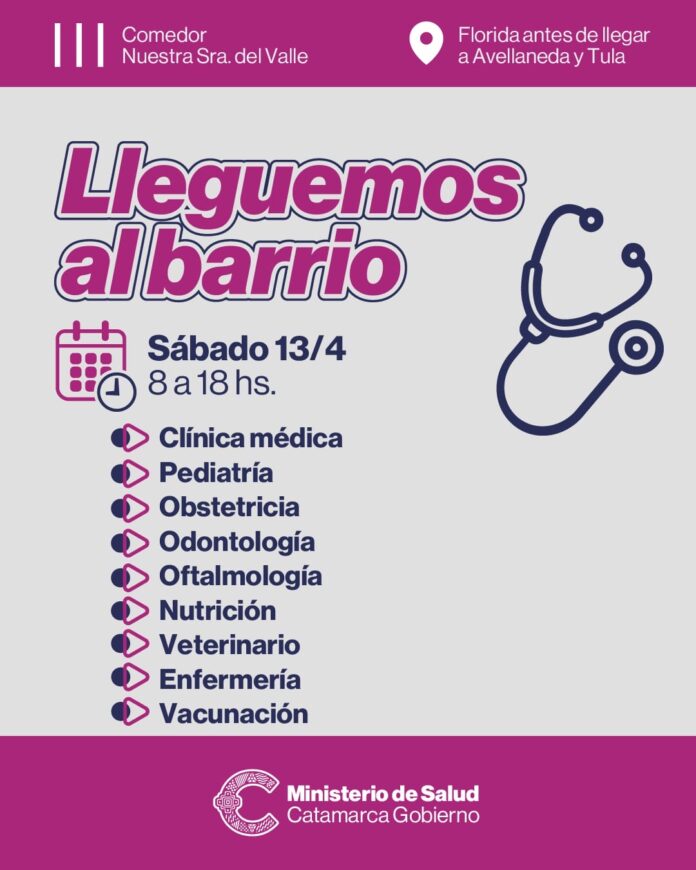 El Ministerio de Salud de la Provincia, a través del Programa “Lleguemos al Barrio”, brindará asistencia en el Comedor Nuestra Señora del Valle, ubicado en calle Florida antes de llegar a Avellaneda y Tula, el día 13 de abril de 8 a 18 horas.