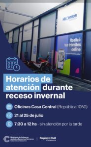 La casa central del Registro Civil de Catamarca, ubicada en calle República al 1052, dio a conocer a la comunidad que durante el receso invernal se implementará un horario especial de atención al público.