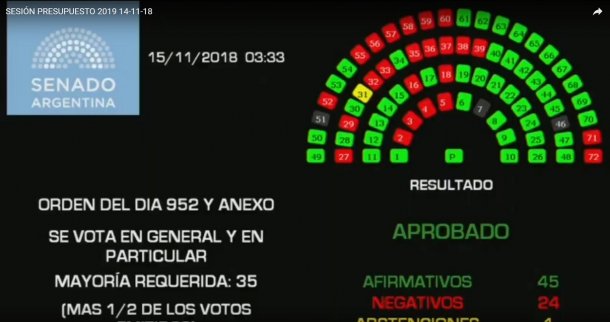 Minutos después de las 3:30 de la madrugada del jueves, 45 senadores pulsaron por la positiva, que superaron a los 24 por la negativa. Además hubo una abstención. La sanción del Presupuesto es clave para el Gobierno, que acordó con el FMI encaminarse hacia el déficit cero, en el marco del crédito que el organismo le otorgó a la Argentina por u$s 56.300 millones. Además, ocurre a días de que se realice en Buenos Aires la Cumbre de Líderes del G20, a la que asistirán los principales mandatorios del mundo.