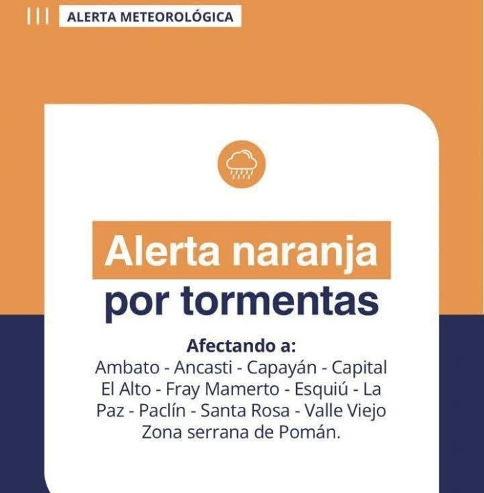Para la madrugada de este lunes, un alerta naranja afectaría los departamentos: Ambato, Ancasti, Capayán, Capital, El Alto, Fray Mamerto Esquiú, La Paz, Paclín, Santa Rosa, Valle Viejo y Pomán.