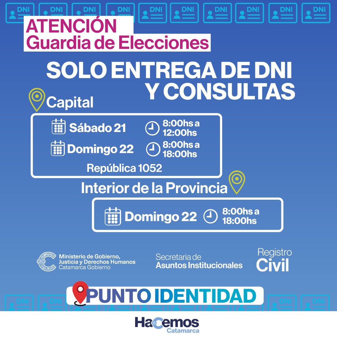 Con motivo de que el próximo domingo 22 de Octubre se realizarán las elecciones presidenciales 2023, el Registro Civil Catamarca organizó el Operativo de Consultas y Entregas de DNI, con horario de trabajo especial por «Guardia de elecciones».