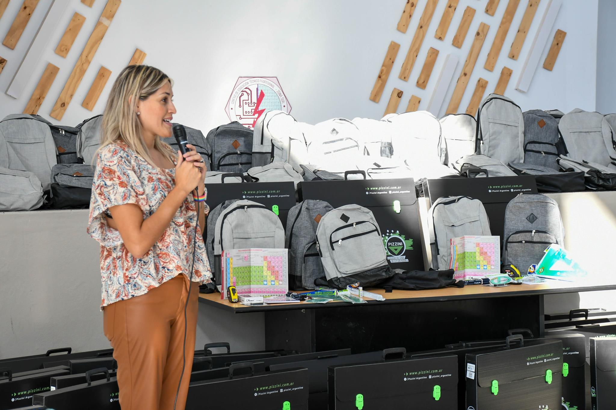 La ministra de Educación de la provincia, Andrea Centurión junto al director de Educación Técnica y Formación Profesional, Miguel Sandoval hizo entrega de 110 mochilas técnicas y tableros, destinados a los alumnos de 1er año de las tecnicaturas en Programación y Electrónica de la Escuela Secundaria del Centro de Educación Técnico Profesional “Presidente Néstor Carlos Kirchner”. Estuvieron también presentes el equipo directivo de la institución educativa a cargo de Roxana Jerez, la coordinadora de Formación Laboral y Profesional, Thelma Lencina, la coordinadora de Fundamentación Básica, Fernanda Leguizamón y el plantel docente.