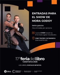 Este jueves 6 de noviembre, se podrán retirar de manera gratuita las entradas para el show «La Máquina Tanguera» de la bailarina Mora Godoy y de su compañía en el marco de la Feria del Libro. Las personas interesadas en asistir al evento, deberán buscar las entradas en el Cine Teatro Catamarca, ubicado en San Martín 555, a partir de las 8 hs y hasta agotar localidades. Se entregarán dos entradas por persona.