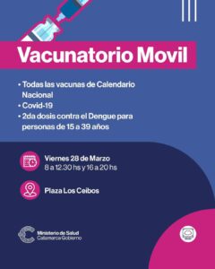 Este próximo viernes 28 de marzo, de 8 a 12.30 hs y de 16 a 20 hs, los vecinos del Barrio Los Ceibos podrán acercarse a su plaza para colocarse todas las vacunas del calendario nacional, COVID-19 y segunda dosis de la inmunización contra el Dengue, esta última para personas de 15 a 39 años. Asimismo se recuerda que se debe asistir con Libreta Sanitaria o carné de vacunación, según corresponda.