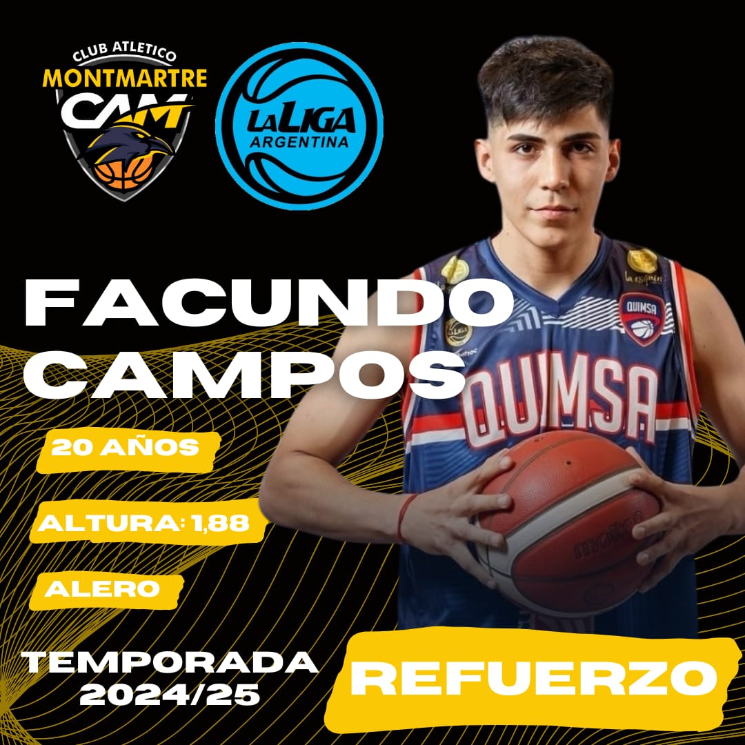 Con novedades llega el primer partido del 2025 para el Club Atlético Montmartre. Para este nuevo año, llega al plantel de Liga Argentina Facundo Campos. Con 20 años, se desempeña como alero y viene de jugar la Liga de Desarrollo con QUIMSA de Santiago del Estero.