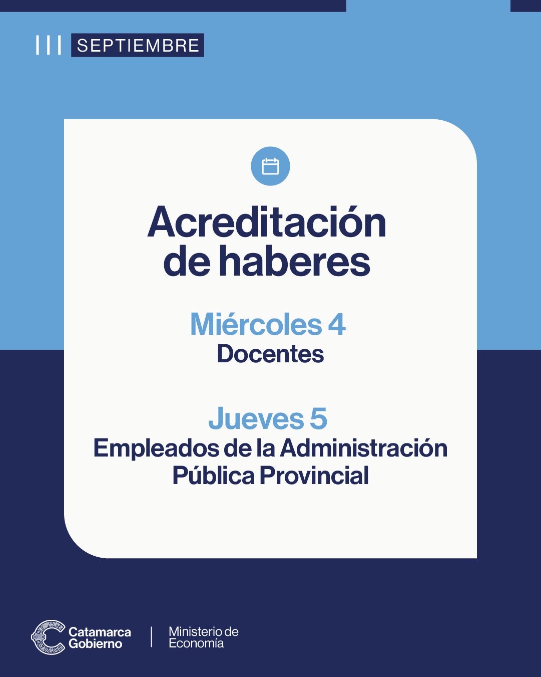 El Ministerio de Economía informa que ya se definió el cronograma de acreditación de haberes correspondientes al mes de agosto, que se cumplirá de la siguiente manera: