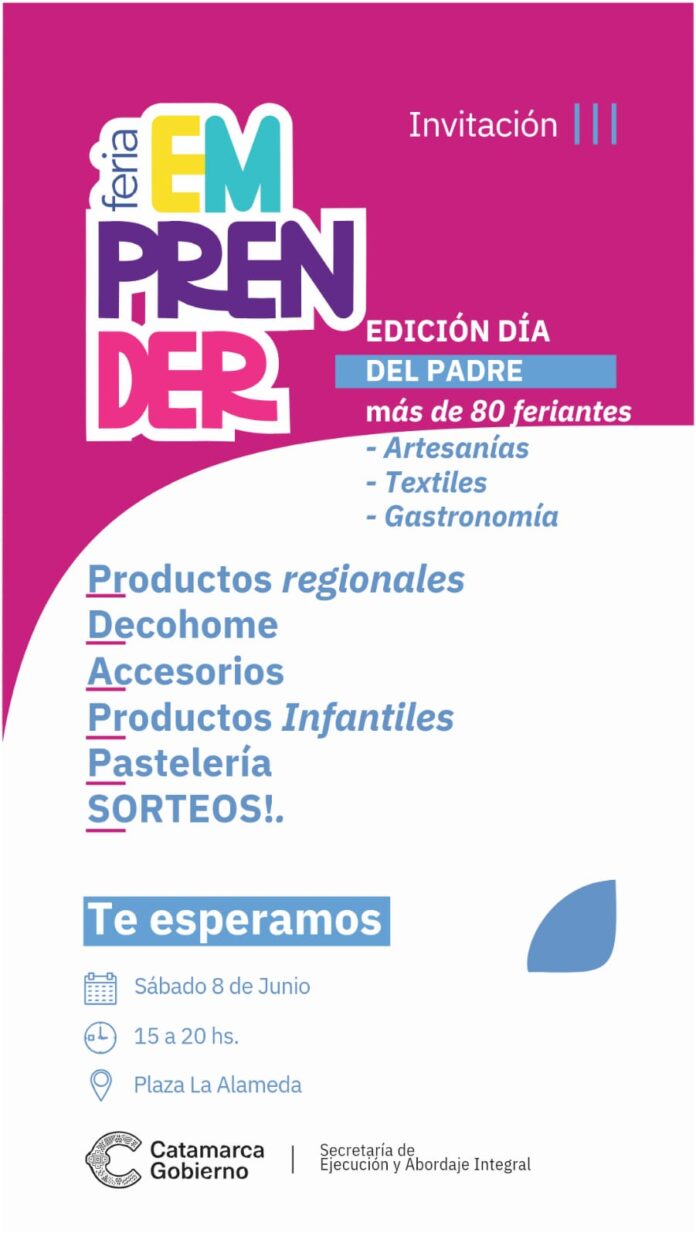 Vuelve como cada mes la Feria Emprender, esta vez con la consigna Edición Dia del Padre, este sábado 8 de junio en La Alameda desde las 15 a 20 hs, el Ministerio de Desarrollo Social lleva a cabo esta feria desde hace varios años en apoyo a Emprendedores, Productores y Artesanos de Catamarca.