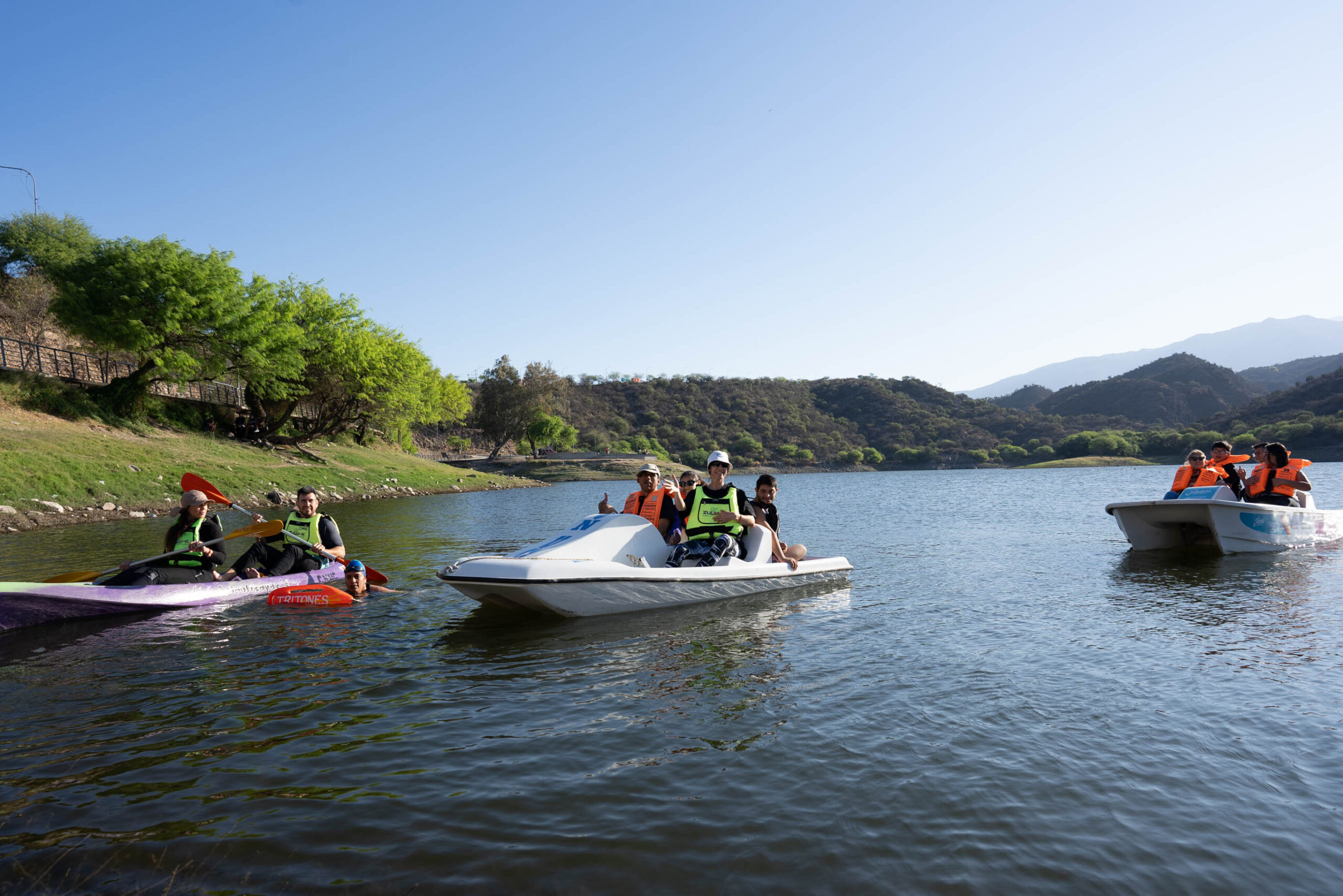 Los botes hidropedal y los kayaks fueron los protagonistas sobre el agua embarcando a los presentes para navegar por el dique bajo la supervisión del Club de Nadadores Unidos. Al mismo tiempo el evento contó con la participación activa de los Tritones, equipo de la Dirección de Deporte Adaptado. También las autoridades del Ministerio, tanto la ministra Daiana Roldán como las secretarias de Gestión Turística, Evangelina Quarín, de Gestión Cultural, Laura Maubecín y su par de Deportes Guillermo Perna participaron de las actividades propuestas.