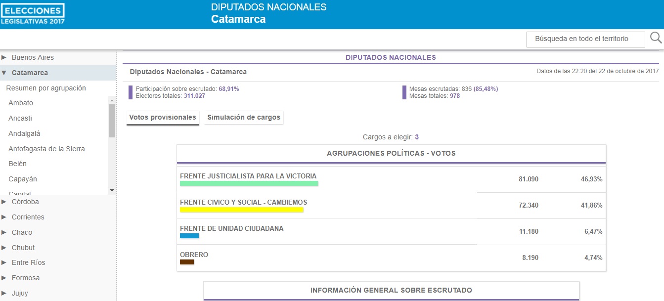 Con el 85% (798) de las mesas escrutadas, el candidato del FJPV, Gustavo Saadi se impone sobre Eduardo Brizuela del Moral (Cambiemos) en la categoría de diputado Nacional.