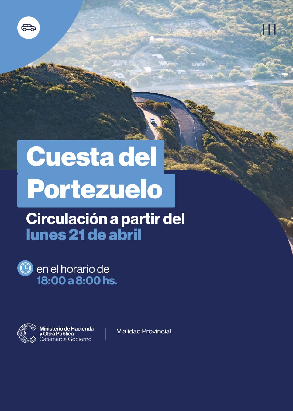 A partir de este lunes 21 de abril, la Cuesta de El Portezuelo se habilitará exclusivamente para vehículos livianos, todos los días en el horario de: