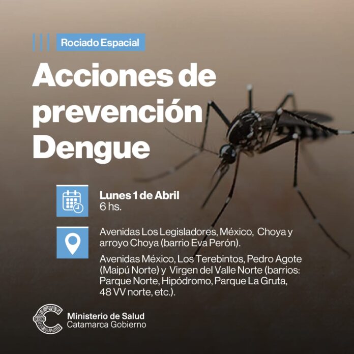 Con el objetivo de prevenir y controlar los focos de proliferación y criaderos del mosquito Aedes aegypti, transmisor del dengue, zika y chikungunya, desde el Ministerio de Salud se siguen realizando acciones en diferentes zonas de la ciudad Capital. Por esto, se informa que este lunes 1° de abril, a partir de las 6 de la mañana, se realizará rociado espacial en dos conglomerados, uno en el Barrio Eva Perón y el otro abarcando barrios de la zona norte.