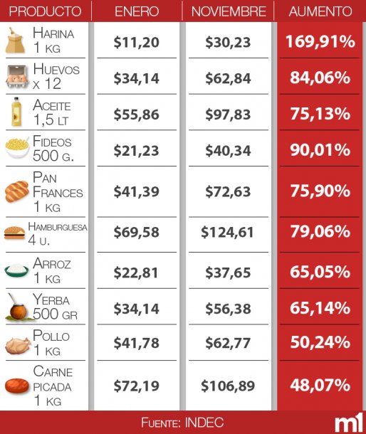 En lo que va del año alginos productos que integran la Canasta de productos que mide el INDEC para medir la inflación subieron casi un 170% como la harina (subió 169,91%) merced del impacto que significó en los precios la quita de retenciones al trigo dispuesta por el gobierno de Mauricio Macri.