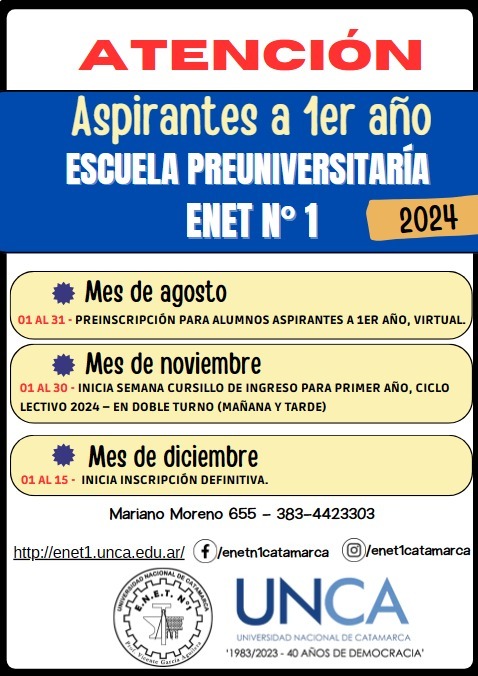 Desde la dirección de la Escuela Preuniversitaria ENET N° 1 se informó que a partir del mes de agosto inician las preinscripciones para ingresantes a primer año ciclo lectivo 2024.