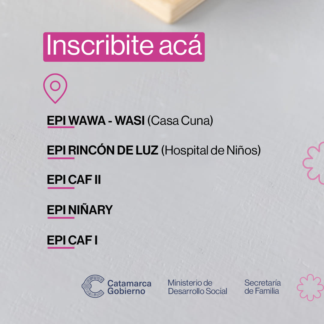 El Ministerio de Desarrollo Social a través de la Secretaría de Familia informa que las inscripciones para las matrículas 2024 de los Espacios de Primera Infancia (EPI) están abiertas de lunes a viernes de 8 a 12 hs y de 15 a 19 hs. Salvo en el EPI Rincón de Luz que atiende solo turno mañana.