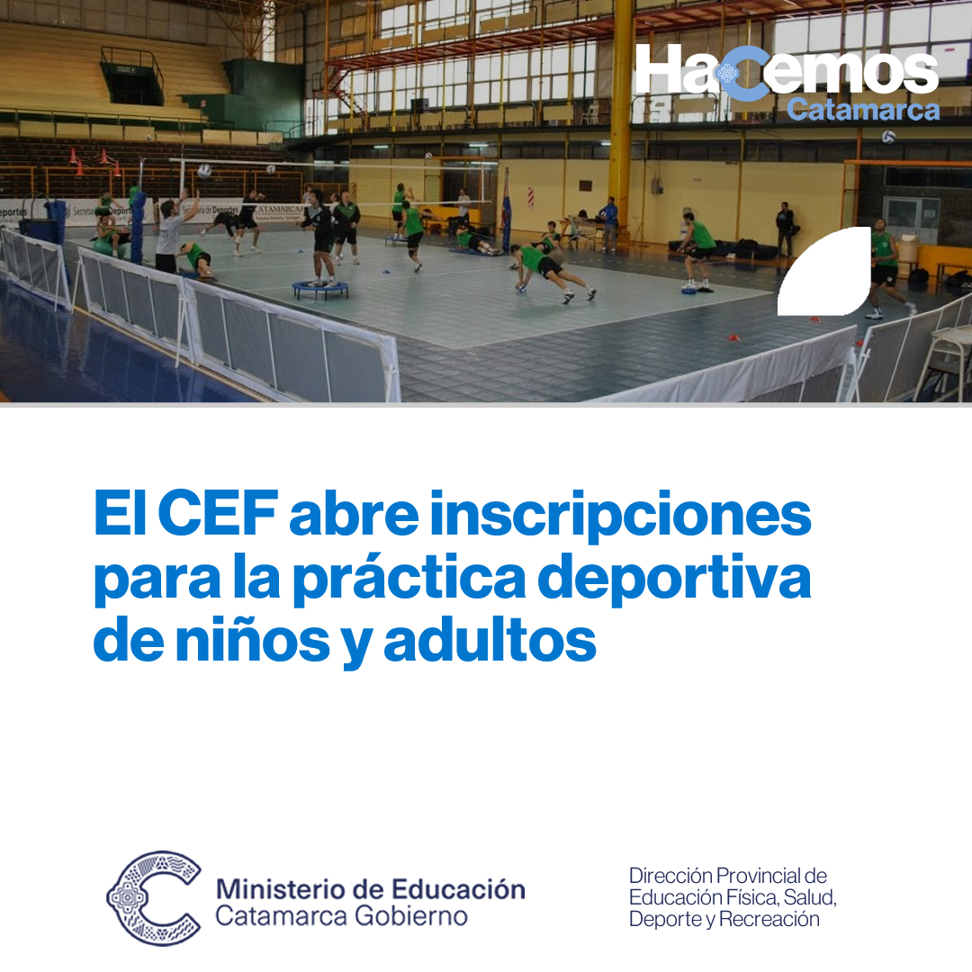 El Ministerio de Educación y la Dirección de Educación Física, Salud, Deporte y Recreación informan a la comunidad que el Centro de Educación Física (CEF) ubicado en el Polideportivo Capital, abre las inscripciones para la práctica de Fútbol, Vóley, Básquet, Gimnasia Artística, Handball y Newcom.